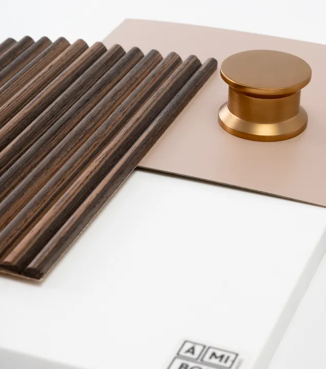 Imaginez une salle de bains ou un dressing en teinte rose nude en contraste avec un ébène texturé. Le blanc en pierre de synthèse apporte la lumière, et une poignée en laiton souligne l’élégance de l’ensemble.