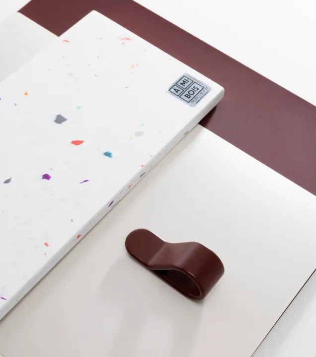 Ici, des poignées pérennes en métal aux formes inspirées du cuir et teintées rouge volcan comme le revêtement linoléum et un matériau éco-construit aux nuances vitaminées à base de déchets plastiques valorisés.