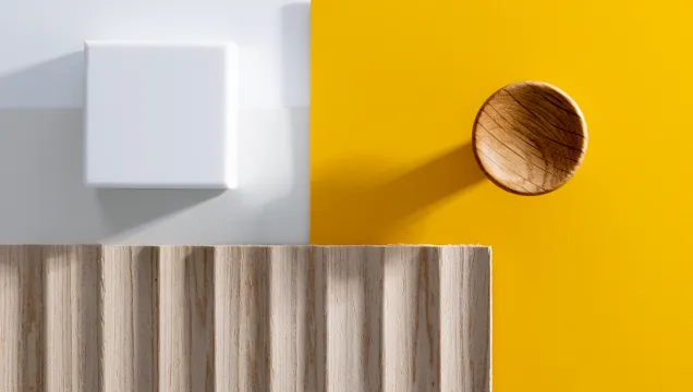 Destinée à une cuisine ou une pièce d’accueil, cette planche combine une texture bois gougé, de la pierre de synthèse blanche et une laque jaune curry. Elle invite la lumière en valorisant ses ombres portées.