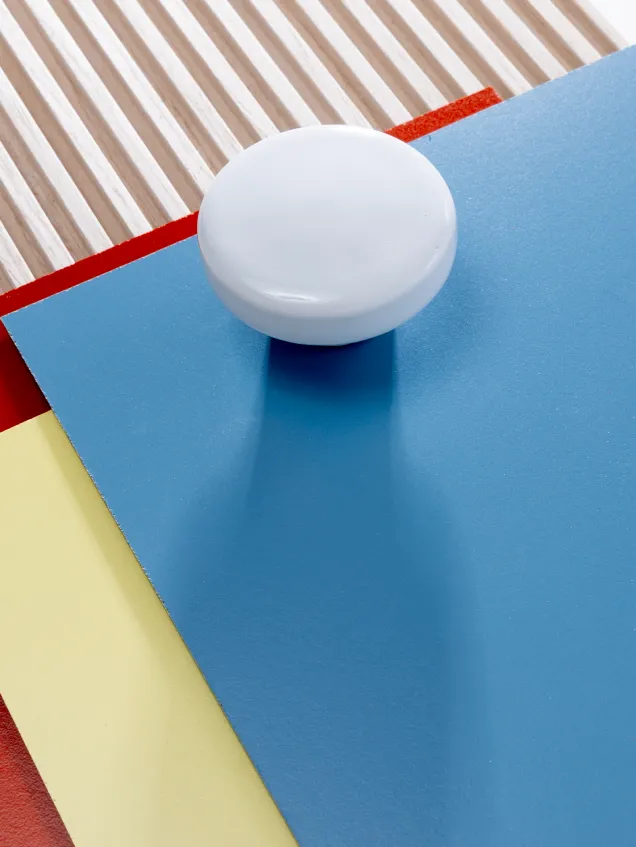 Clin d’œil au vintage et à l’esprit originel Formica, cette planche joue des couleurs citron, vermillon, bleu cèdre avec ses boutons en porcelaine blanche. Le panneau en chêne clair peut être sculpté sur mesure. À imaginer dans une salle de bain, une cuisine ou un espace de réception.