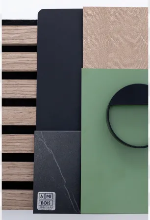 Pensée pour un bureau, une zone d’accueil ou un open space, cette planche associe la rigueur du noir à la chaleur des teintes naturelles du bois et maille textile. Les liteaux sur feutre acoustique suppriment la résonance.